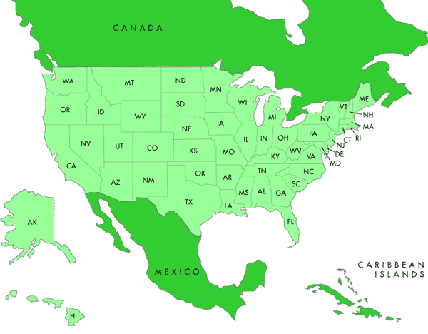 Caribbean Islands Caribbean Islands Maine Connecticut Rhode Island Massachusetts New Hampshire Vermont New York New Jersey Maryland Delaware Pennsylvania West Virginia Virginia North Carolina South Carolina Florida Georgia Alabama Tennessee Kentucky Ohio Mississippi Indiana Michigan Illinois Wisconsin Louisiana Arkansas Missouri Iowa Minnesota Mexico Hawaii Alaska Oklahoma Kansas Nebraska Colorado South Dakota North Dakota Texas New Mexico Arizona Utah Wyoming Montana Idaho Nevada California Oregon Washington CANADA